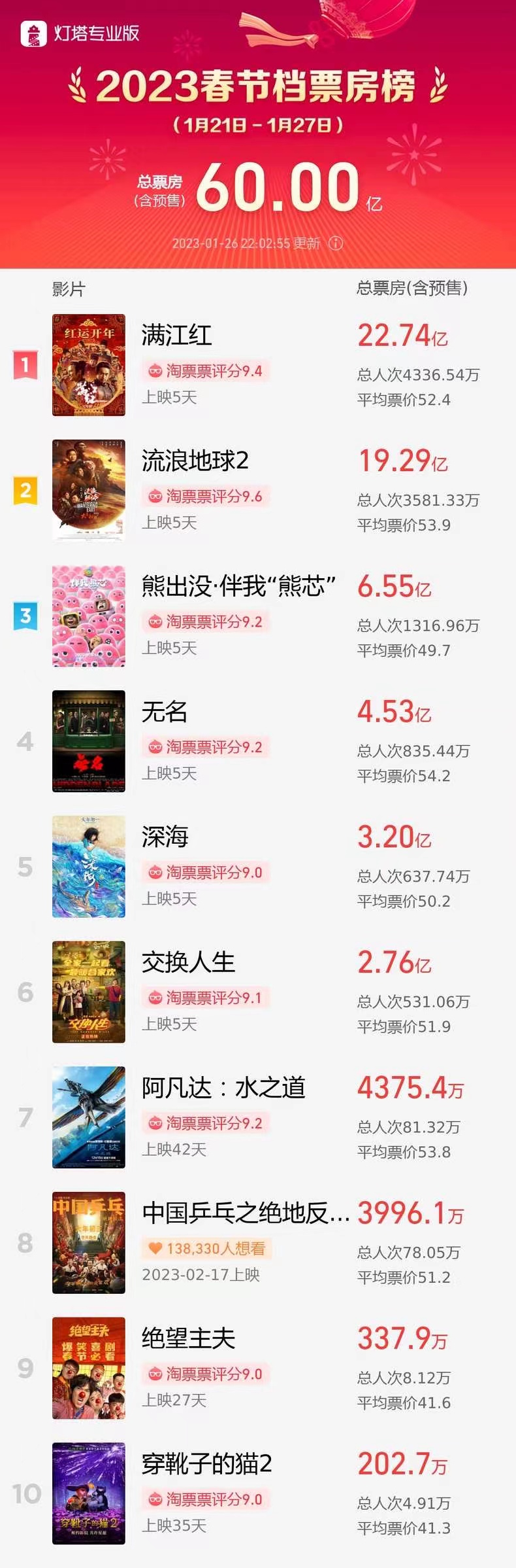 据灯塔专业版实时数据,1月26日22时02分,2023春节档(1月21日-1月27日)总票房(含预售)突破60亿元。《满江红》《流浪地球2》《熊出没·伴我“熊芯”》分列票房榜前三名。