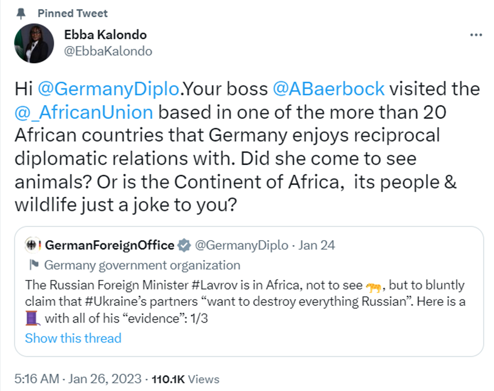 美联社称,上述帖子将非洲大陆描述成只有野生动物的形象,这引起卡隆多的不满,她回应此事时提到德国外长贝尔伯克本月早些时候也曾访问非洲。卡隆多在推特上@德国外交部的账号并回应称,“德国与20多个非洲国家保持互惠外交关系,你们的部长曾到访非盟设立在其中一个非洲国家的总部。她是来看动物的吗?还是非洲大陆及其人民和野生动物对你们来说只是一个笑话?”↓