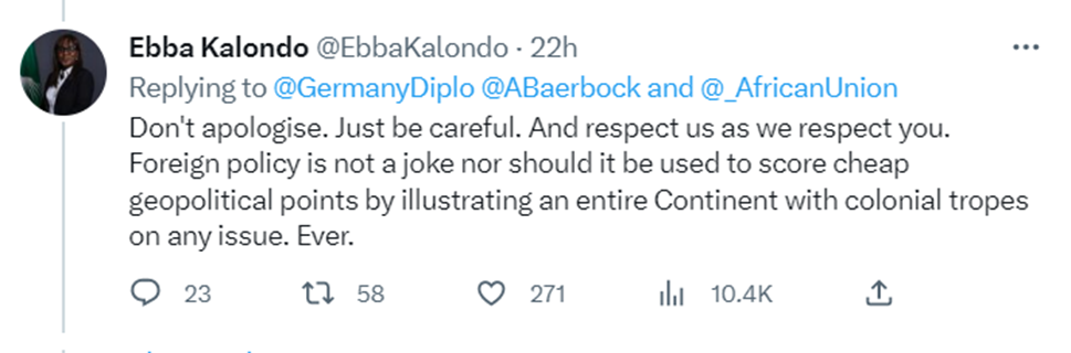 卡隆多紧接着回复这条推文说,“不用道歉。只是要谨慎。请像我们尊重你们那样尊重我们。外交政策不是玩笑,也不应该在涉及任何问题时用殖民式的比喻来描述整个(非洲)大陆,从而获得廉价的地缘政治分数”。↓