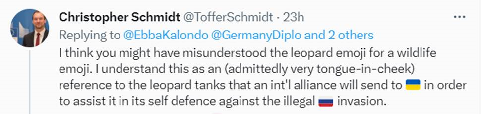 对于卡隆多的回应,报道说,德国驻南非大使馆发言人克里斯托弗·施密特表示,“我认为您可能将‘豹子’表情符号误解为(代表)野生动物的表情符号。我将此理解成(不可否认这是半开玩笑的)国际联盟将向乌克兰运送的‘豹’式坦克,以协助其自卫,抵御俄罗斯的非法入侵”。↓