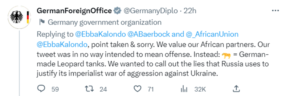 对此,德国外交部回应说,“观点已收到,抱歉。我们重视我们的非洲伙伴。我们的推文绝对无意冒犯。相反,豹子(表情符号)相当于德国制造的‘豹’式坦克。我们想要揭露俄罗斯用来为其侵略乌克兰的帝国主义战争辩护的谎言”。↓