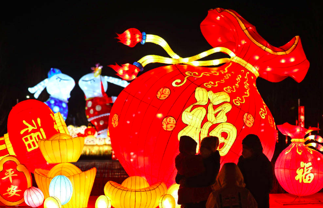 游客在辽宁沈阳故宫门前广场赏灯留影。新华社记者 姚剑锋 摄