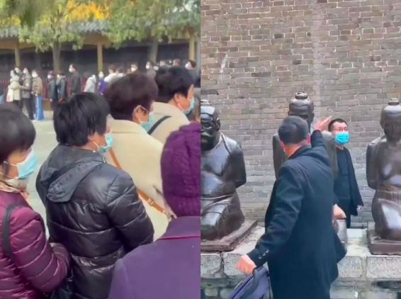 市民马女士向记者介绍,打“秦桧”的视频拍摄于1月23日(大年初二),当时有不少游客排队打“秦桧”跪像,有人打头摸肩,有人拍腿,其中一位女游客拿着鞋抽打了多次。