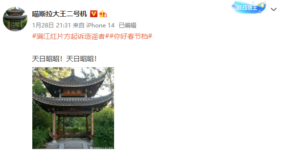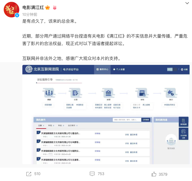 28日,《满江红》官博发文表示已对造谣者提出诉讼。文中称,近期部分用户通过网络平台捏造有关电影《满江红》的不实信息并大量传播,严重危害了影片的合法权益,现正式对以下造谣者提起诉讼。
