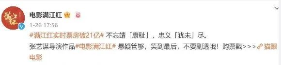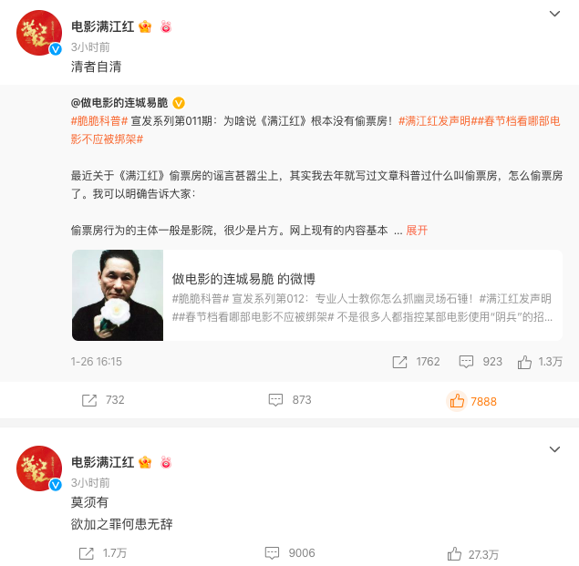 1月26日,电影《满江红》官方微博曾发布声明,回应网传“幽灵场”“偷票房”“买票房”“资本操控”“抄袭”等指控“均为无稽之谈”。