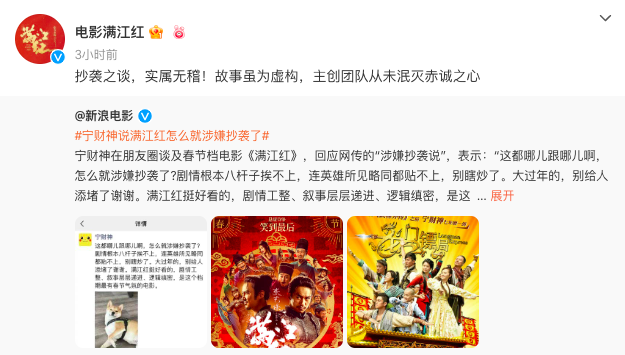 该官博表示“莫须有,欲加之罪何患无辞”;并转发科普《满江红》没有偷票房的文章,表示“清者自清”;回应网传“涉嫌抄袭说”,表示“抄袭之谈,实属无稽!故事虽为虚构,主创团队从未泯灭赤诚之心”等。