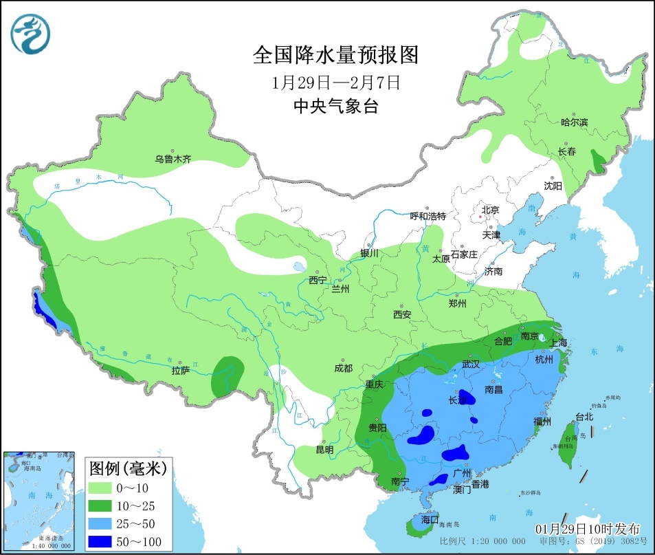 未来10天(1月29日-2月7日),江汉南部、江淮、江南大部、华南大部及贵州、西藏西南部等地累计降水量有10~30毫米,部分地区50~60毫米;西北地区东南部、内蒙古东部、东北地区中北部等地累计降水量有3~10毫米;上述大部地区较常年同期偏多2~6成,局地偏多1倍左右。