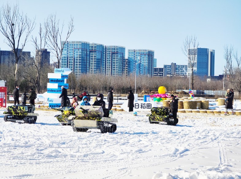 台湖镇稻小蟹艺术农场里,冰雪亲子乐园同样欢乐。总占地面积约10万平方米的园区里,稻田元素随处可见,超300亩的稻草被统一回收捆扎,打造出专属的稻田迷宫和大型摆件,复古冰车让大人们寻回了儿时的记忆,让小朋友体会到了父母童年的乐趣。游客王先生说:“这里既能玩冰雪项目,又可以感受田园气息,一次游园双重感受。”