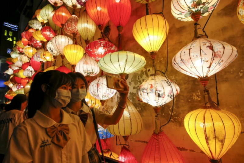 在许愿树下与花灯墙合影,花灯锦簇,老街如昼。