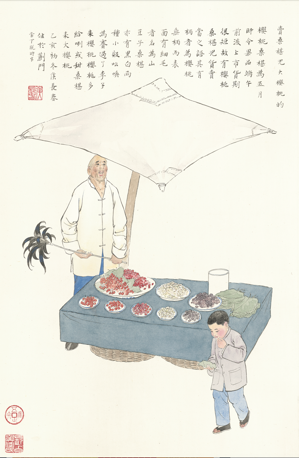 樱桃、桑葚儿是五月中的时令果品,大约在端午节前后上市,货期很短,所以有“樱桃桑葚儿,货卖当时”俗语。有柄的是樱桃,没有果柄的,表面有细毛的是山豆子,桑葚也有黑白两种。卖时拿大杨树叶托着,吆唤为“赛过了李子来樱桃,樱桃,多给咧”,或“甜桑葚来,大樱桃”。