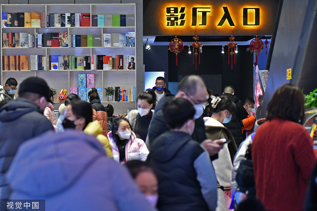 1月26日,山东烟台的一家影院内,观众正在排队入场。(图源:视觉中国)