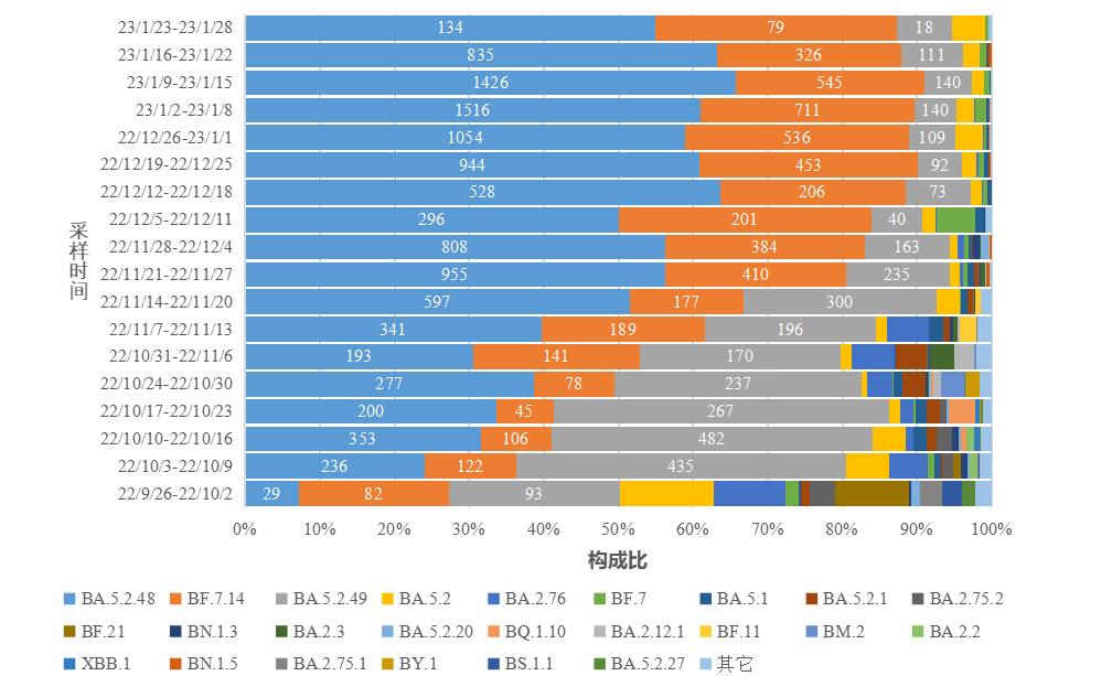 说明:采样时间:2022年12月1日-2023年1月28日;2.图中标记的数字分别为BA.5.2.48、BF.7.14和BA.5.2.49进化分支有效基因组序列数量。