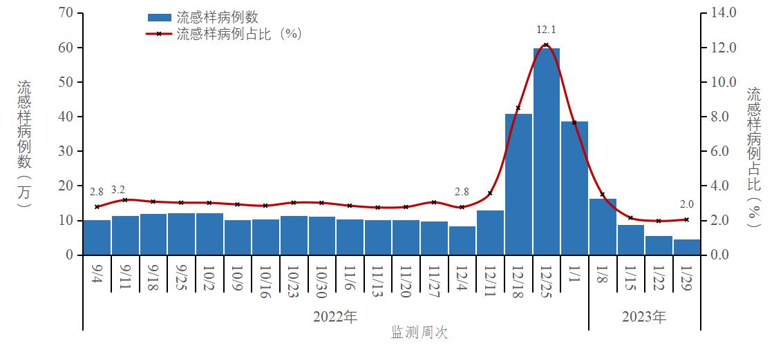 (四)哨点医院监测结果。2022年12月9日起,在我国已建立的824家流感监测网络哨点医院(包括国家级哨点医院546家、省级哨点医院278家)和402家国家级网络实验室开展新冠病毒核酸检测。结果显示:2022年9月-12月上旬,哨点医院每周流感样病例(体温≥38℃,伴咳嗽或咽痛之一)数量稳定在10万左右,至第51周(12月19日-25日)达到最高60万;流感样病例占门(急)诊就诊人数比值在2.7%-3.6%区间波动,第50周(12月12日-18日)明显上升至8.5%,第51周达到最高12.1%,第52周起快速下降;2023年第4周(1月23日-29日)已下降至2.0%,回落至本轮疫情之前水平(图2-4)。