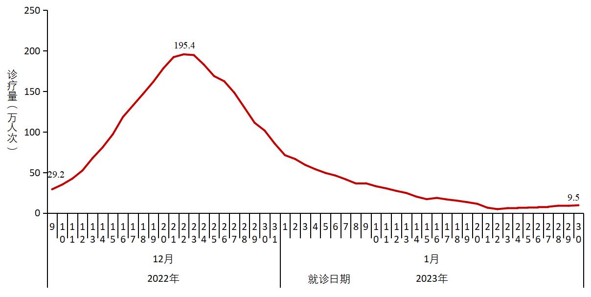 (三)城市发热门诊就诊人数结果。全国二级以上医疗机构和城市社区卫生服务中心发热门诊(诊室)就诊人数于2022年12月22日达到峰值195.4万人次,随后连续下降;1月23日后呈低位波动,1月30日为9.5万人次,较峰值下降了95.1%(图2-3)。