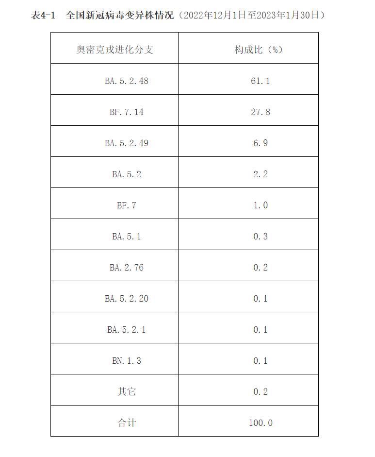 (二)12月以来本土病例病毒变异株监测情况。2022年12月1日至2023年1月30日,全国共报送11878例本土病例新冠病毒基因组有效序列,全部为奥密克戎变异株,共存在26个进化分支。主要流行株为BA.5.2.48(61.1%)和BF.7.14(27.8%)(表4-1)。共发现重点关注变异株12例,其中,1例XBB.1,4例BQ.1.1,1例BQ.1.1.17,4例BQ.1.2,2例BQ.1.8。