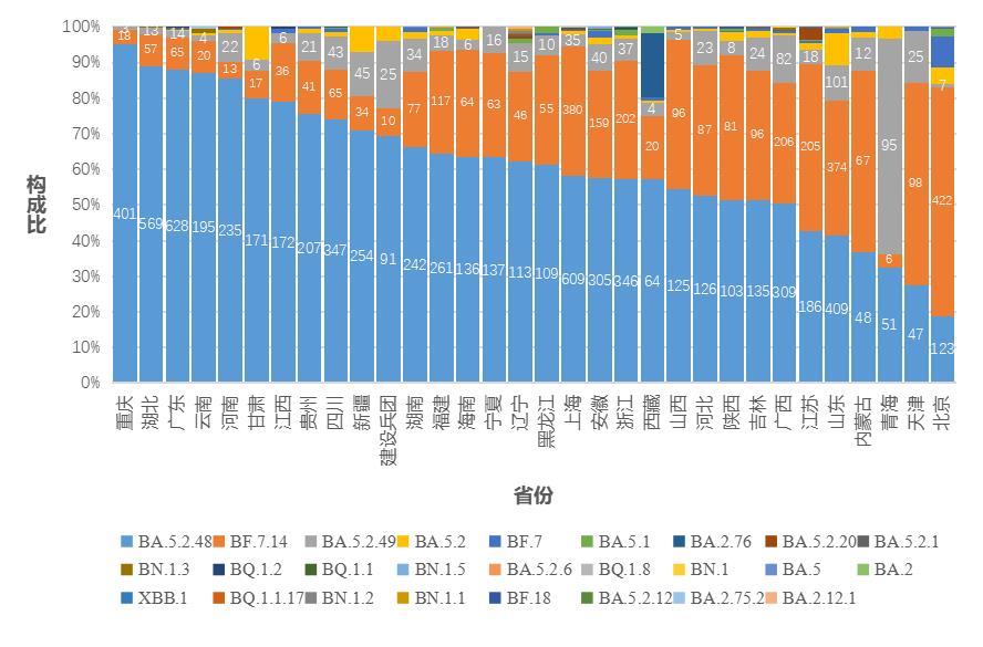 2.图中标记的数字分别为BA.5.2.48、BF.7.14和BA.5.2.49进化分支有效基因组序列数量。