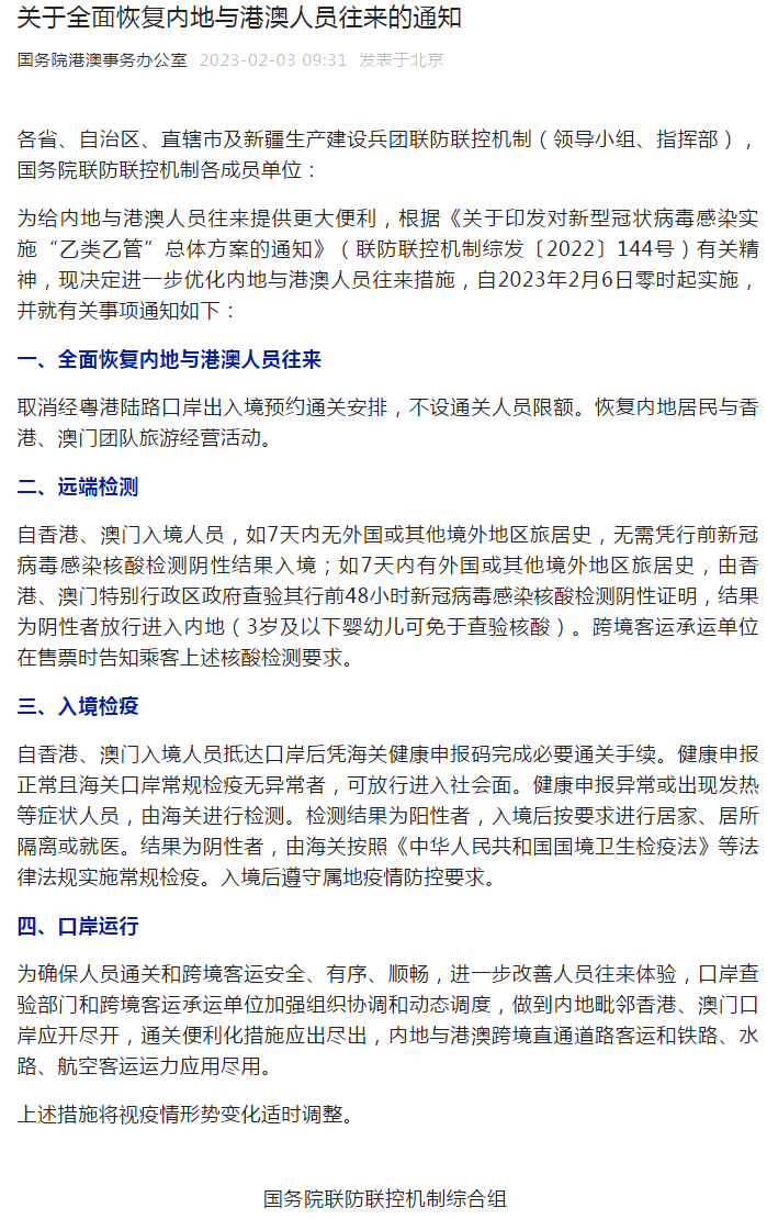为给内地与港澳人员往来提供更大便利,根据《关于印发对新型冠状病毒感染实施“乙类乙管”总体方案的通知》(联防联控机制综发〔2022〕144号)有关精神,现决定进一步优化内地与港澳人员往来措施,自2023年2月6日零时起实施,并就有关事项通知如下:
