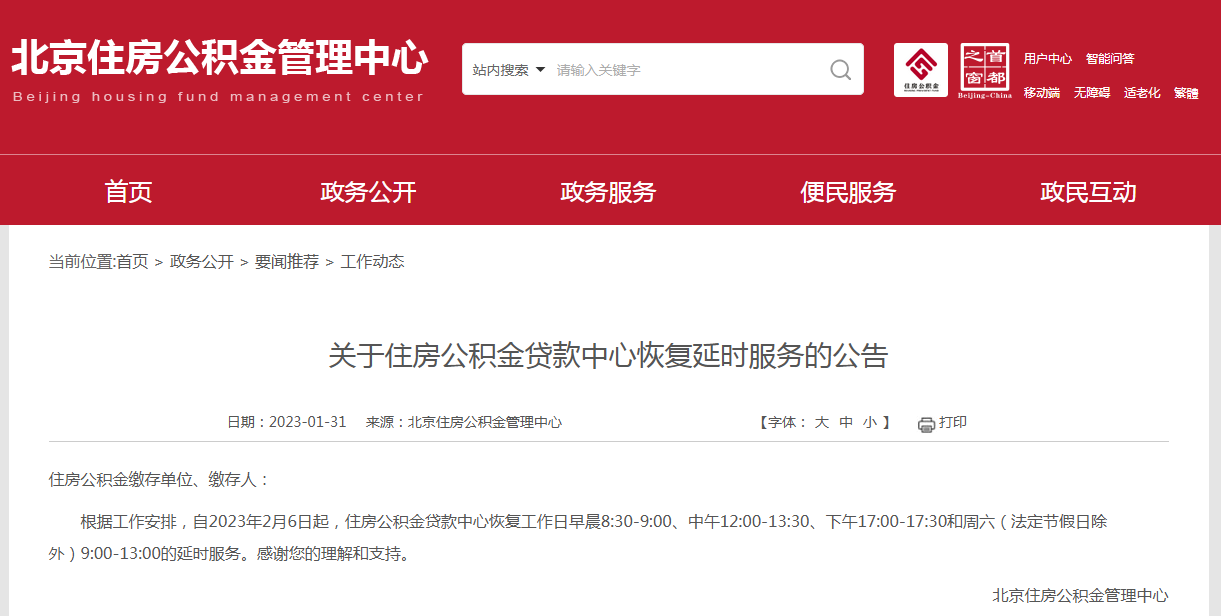 北京住房公积金管理中心发布公告,自2023年2月6日起住房公积金贷款中心恢复工作日早晨8:30-9:00、中午12:00-13:30、下午17:00-17:30和周六(法定节假日除外)9:00-13:00的延时服务。