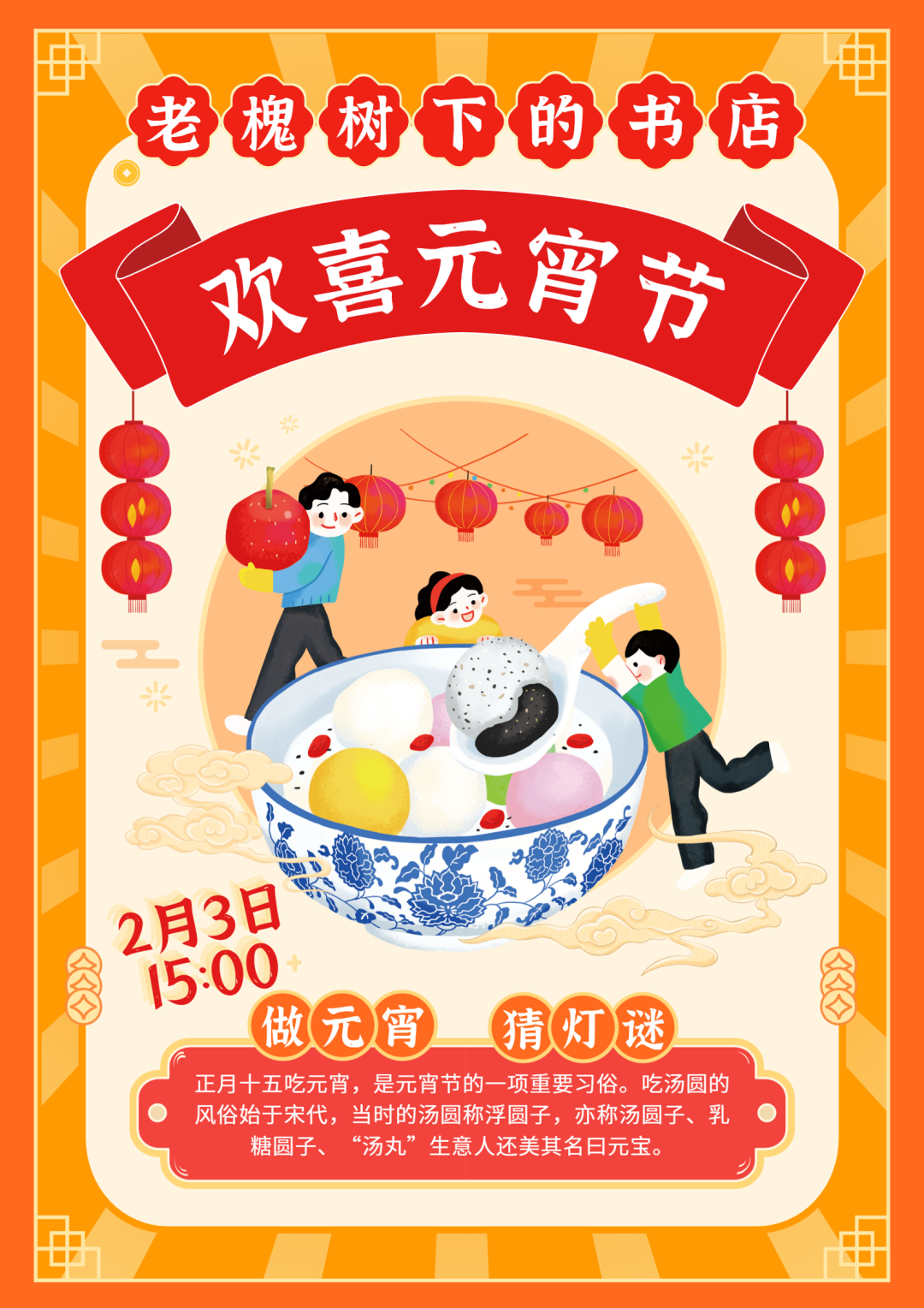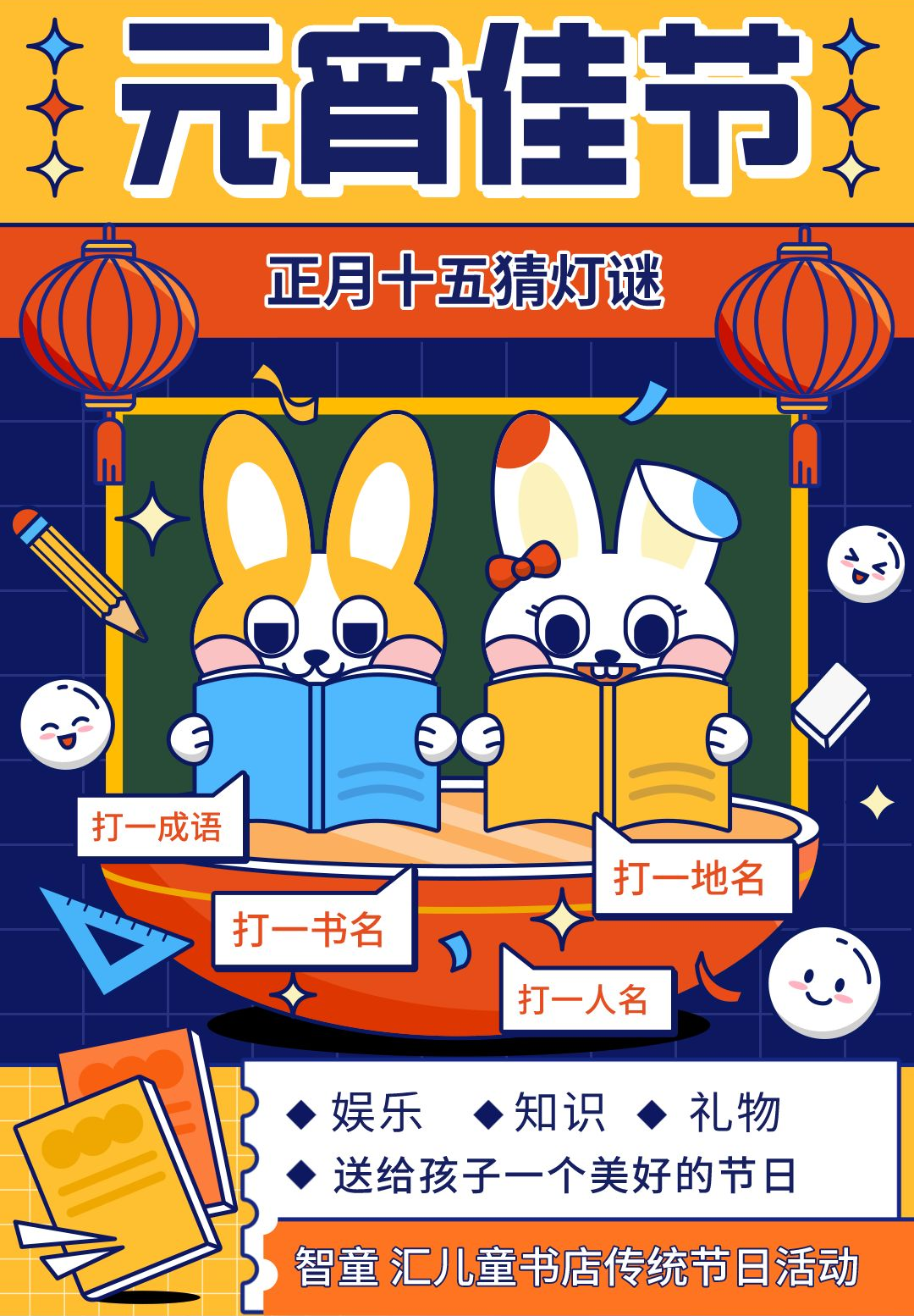 正月十五元宵节是中华民族的传统节日,也是春节后的第一个节日,在这天人们吃元宵、赏花灯、猜灯谜。智童汇儿童书店精心为市民准备了200条谜语和小礼品,希望大家可以在此度过一个美好的节日。