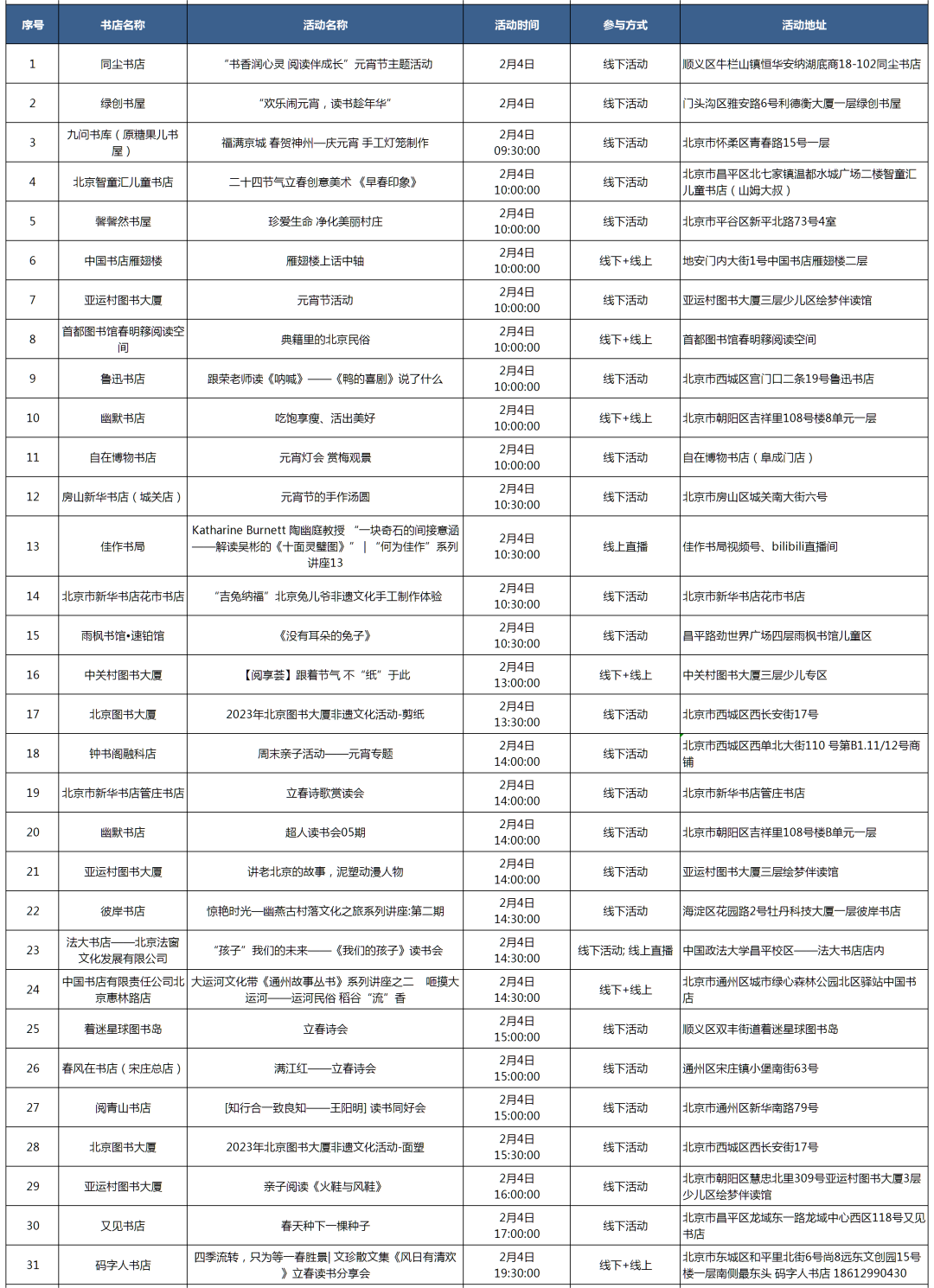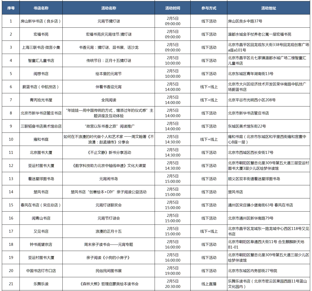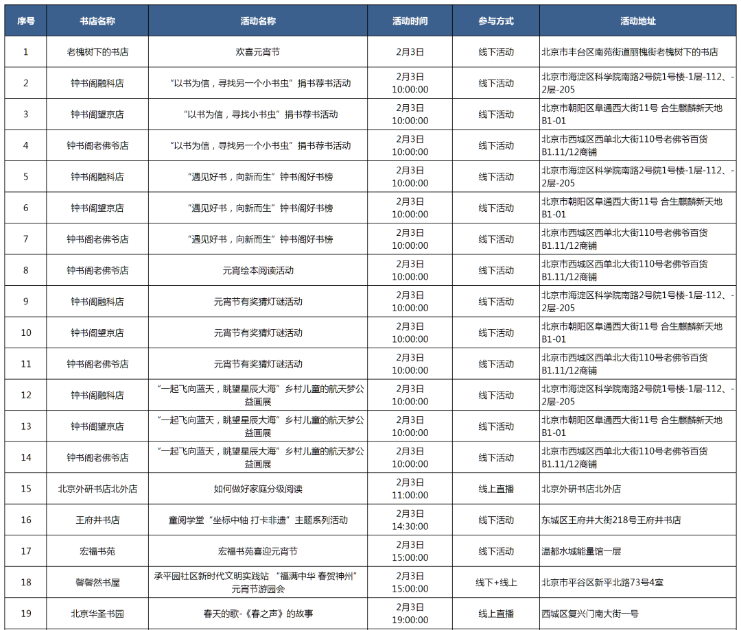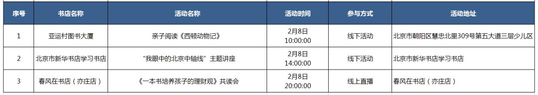 温馨提示:参加活动前请联系书店确认活动信息。更多活动信息详见图表(收集时间为2月2日18时前)↓↓