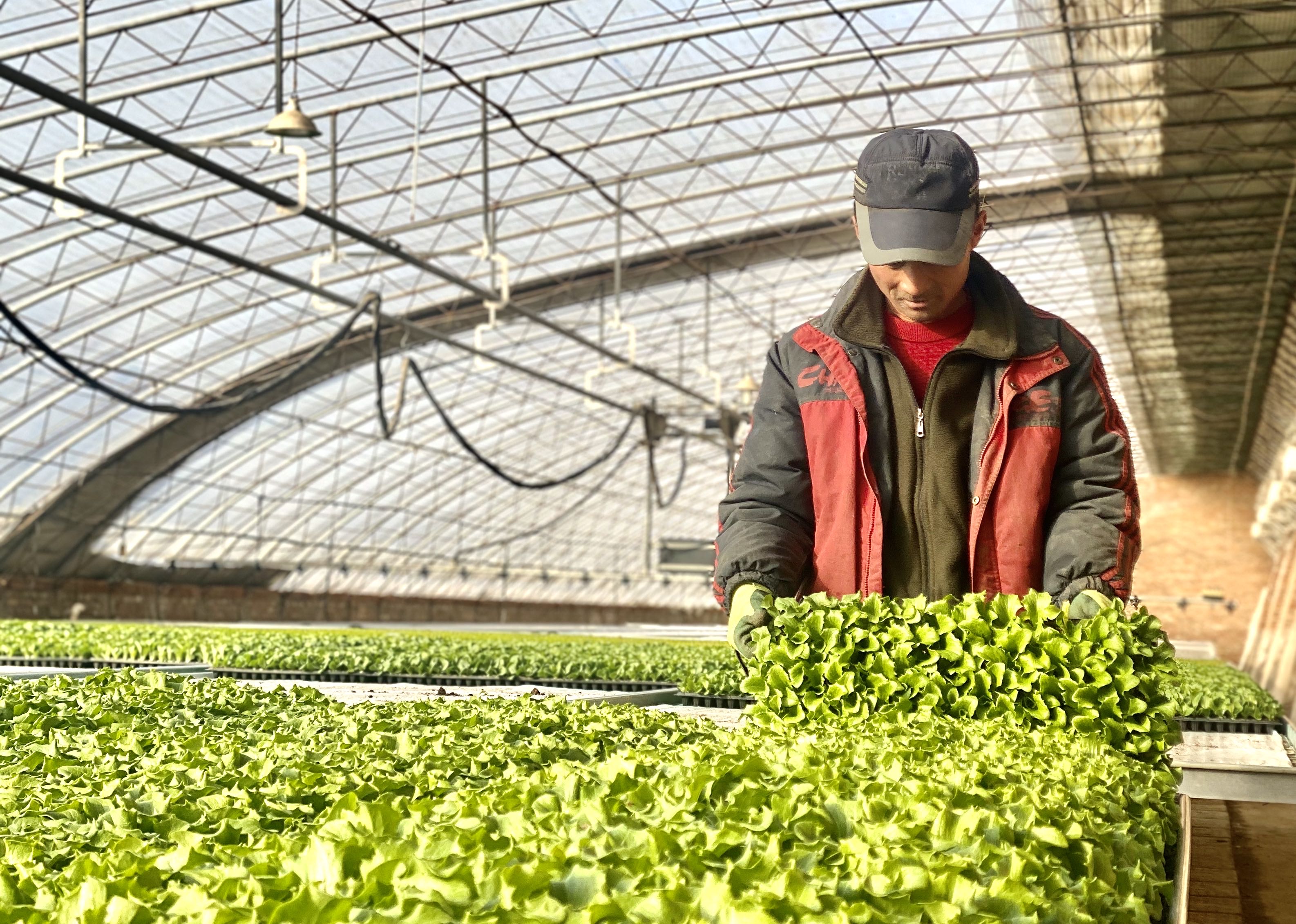 北京永盛园农业种植中心育苗日光温室里,生菜的种子从泥土里挤出了三瓣嫩芽,它们要努力生长,赶在春暖花开的日子,丰盈千家万户的餐桌。