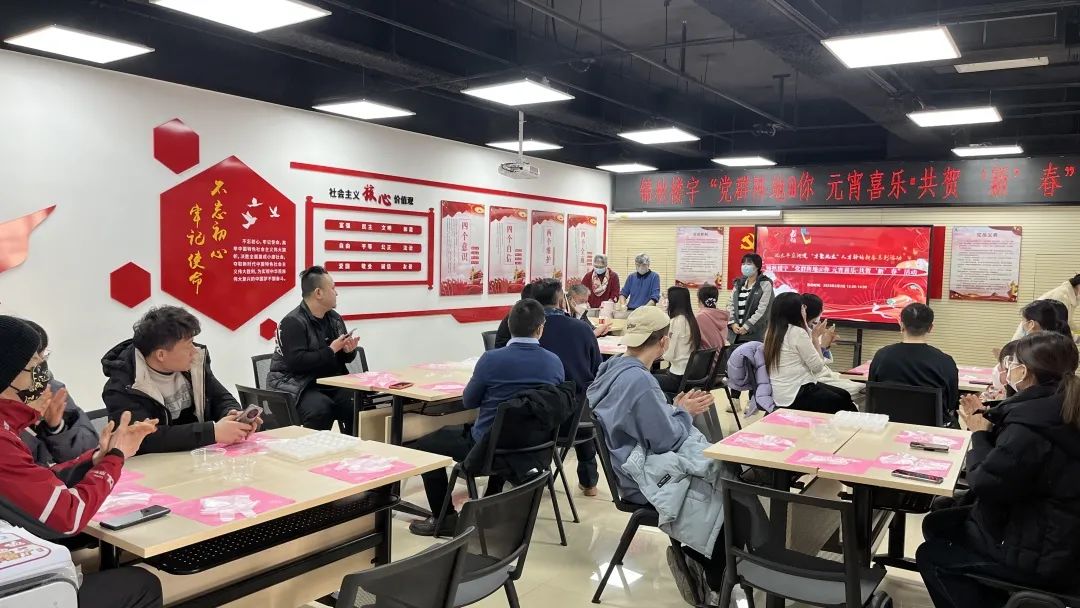 中关村街道世纪科贸中心党建e站,辖区两新党组织党员代表、快递小哥等新就业群体代表欢聚一堂,吃饺子、闹元宵、做游戏、表演节目,现场热闹又“烧脑”,“你问我答”小游戏、传统习俗猜灯谜,还有各类互动小游戏,大家玩得开心,吃得甜蜜,欢欢喜喜过佳节。