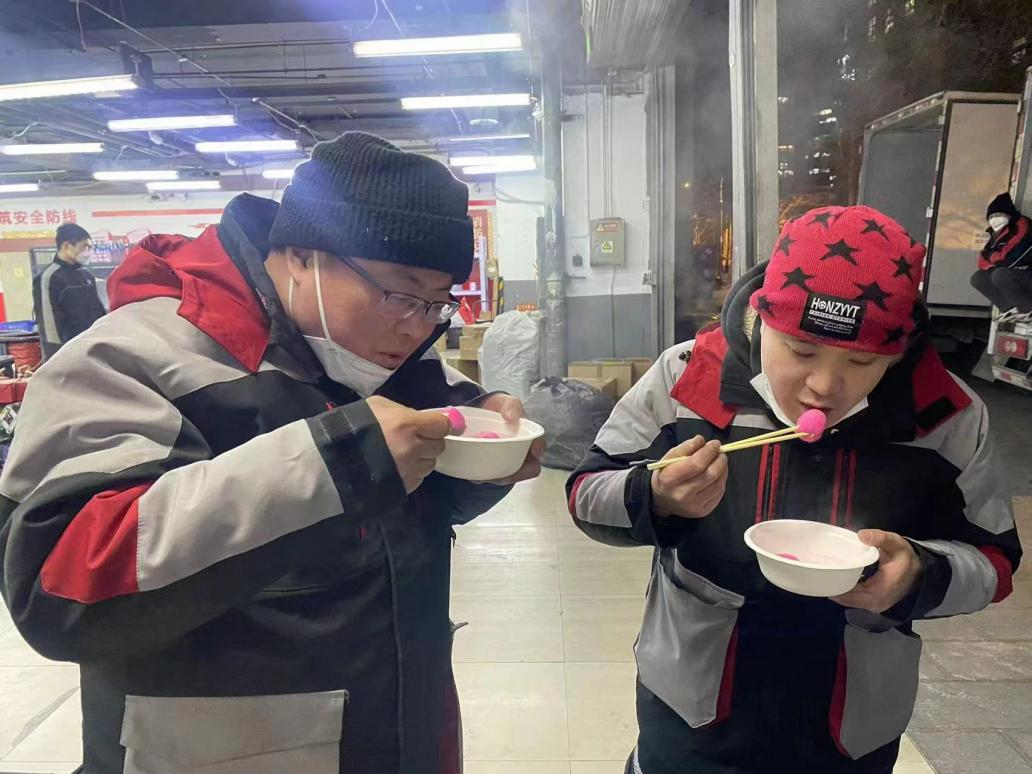 “大过节的您依然坚守岗位,辛苦了!”“元宵节快乐,吃碗汤圆暖暖身子吧。” “亲手包的汤圆更香更甜、更暖心胃!”海淀街道工作人员亲手为快递员们端上一碗碗热气腾腾的元宵,也送上他们浓浓的关爱。