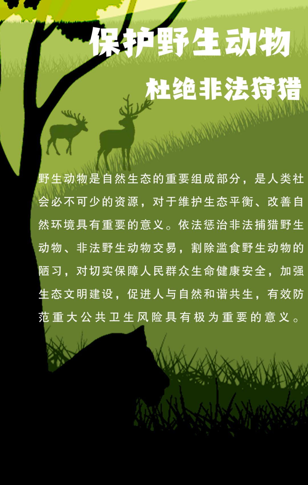 保护野生动物关乎生态环境,更关系人类福祉!非法狩猎野生动物,不仅对生态多样性造成破坏,更可能触犯刑律。保护生态环境,杜绝非法狩猎,从你我做起。