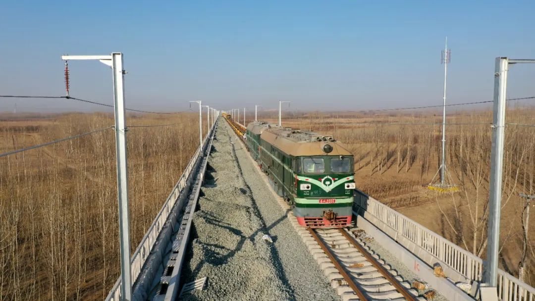 2月1日傍晚,伴着落日余晖,位于河北省廊坊市安次区的津兴铁路安次站正北两公里处,CPG500型铺轨机组正拖拽着钢轨进行全线有砟轨道铺设。