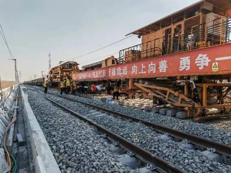 津兴铁路铺轨工程包括正线92.956公里,站线铺轨7.15公里,道岔36组,正以日均2公里的速度推进铺轨施工。目前安次站至永清特大桥左线机械铺轨已全部完成,正进行右线单边铺轨作业,道岔铺轨完成29组。