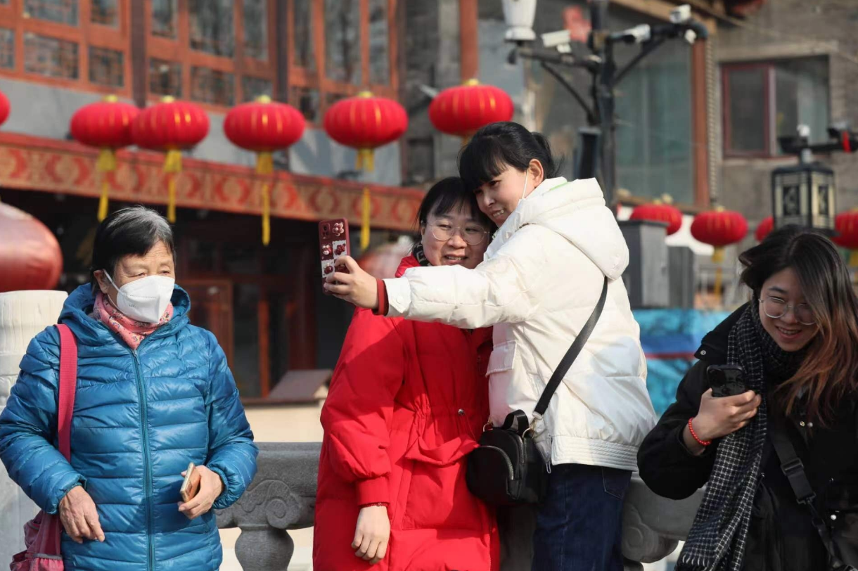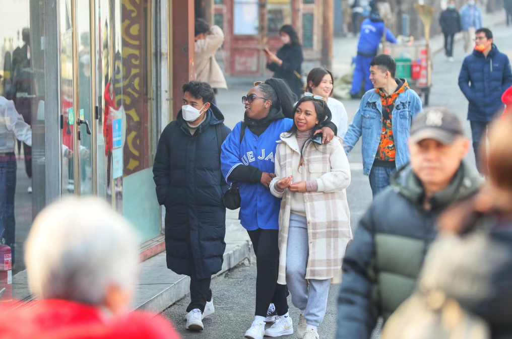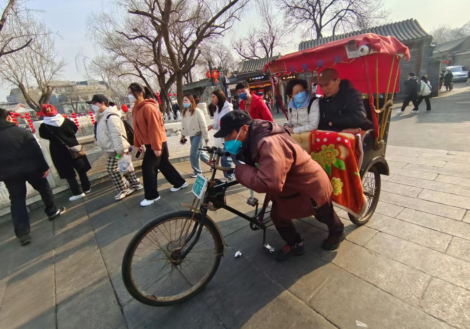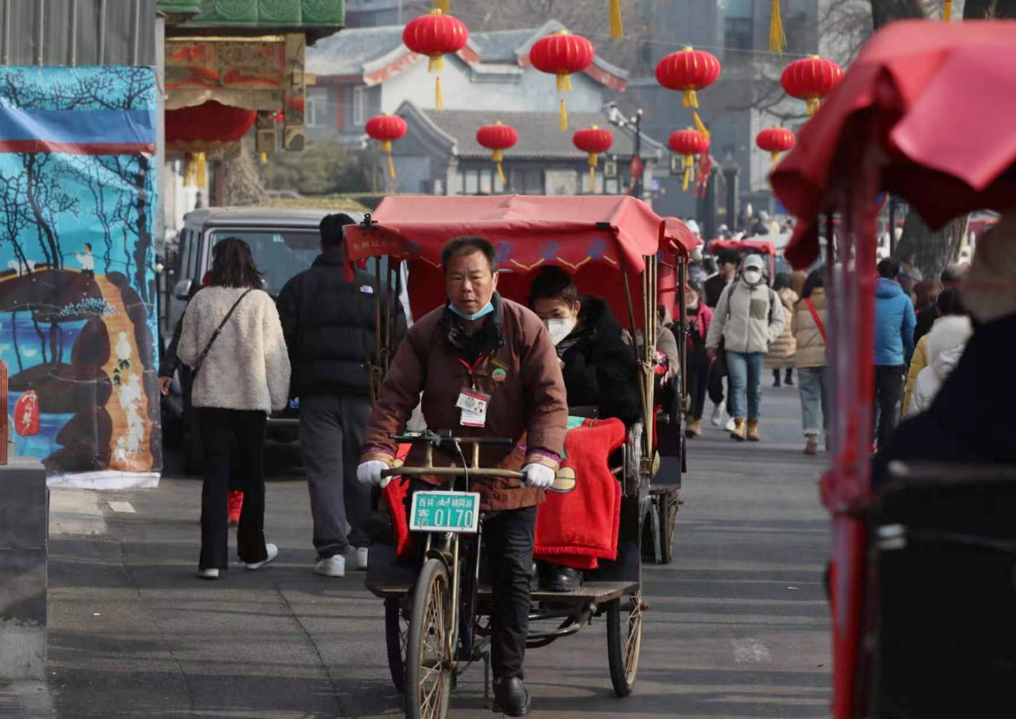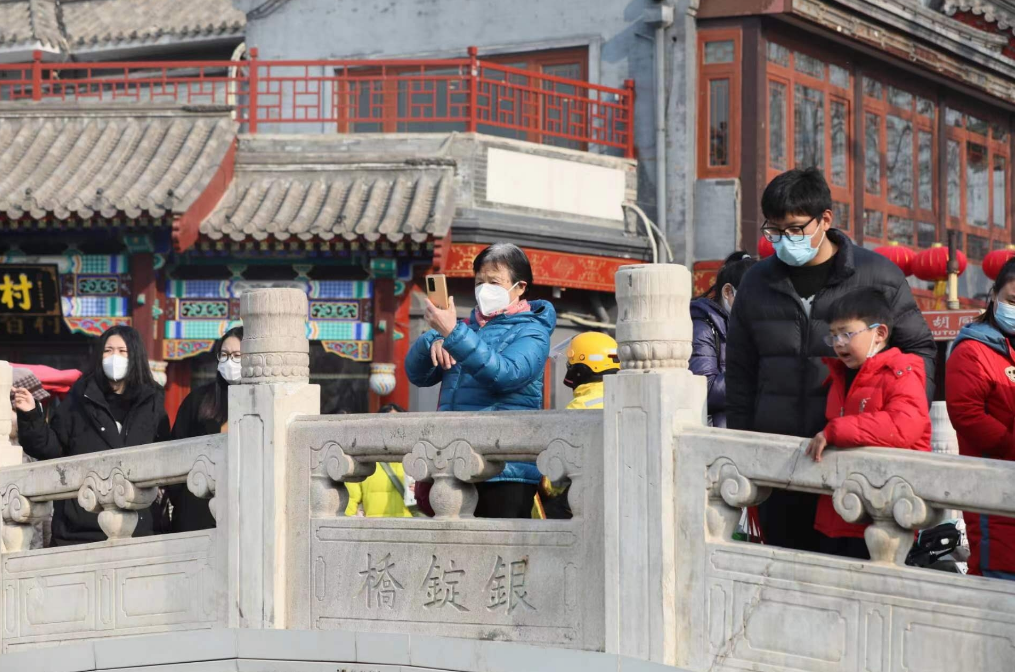 2月7日,北京天气晴朗。在什刹海历史文化街区,中外游客游走在古都风貌之中,客流的逐渐恢复为景区又带来了生气。