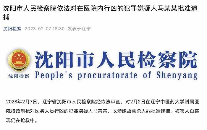 “沈阳检察”微信公众号消息,2023年2月7日,辽宁省沈阳市人民检察院经依法审查,对2月2日在辽宁中医药大学附属医院持改制枪对医务人员行凶的犯罪嫌疑人马某某,以涉嫌故意杀人罪批准逮捕。被害人白某现仍在抢救中。