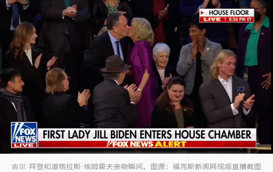 美东时间2月7日21时许,美国总统拜登在美国会大厦发表就任总统以来的第二场国情咨文演讲。美国福克斯新闻网注意到,美国“第一夫人”吉尔·拜登和“第二先生”道格拉斯·埃姆霍夫(注:美国副总统哈里斯的丈夫)在拜登发表演讲之前互相亲吻,这一幕也被拍了下来。