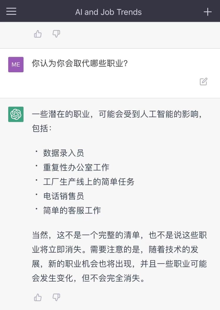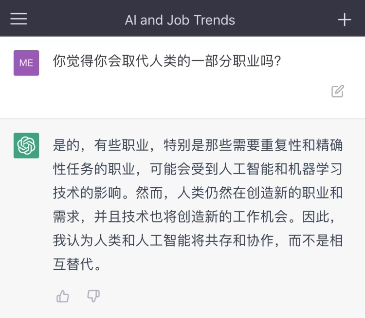 不过,ChatGPT“安慰”说:人类仍然在创造新的职业和需求,并且技术也将创造新的工作机会。因此,人类和人工智能将共存和协作,而不是相互替代。