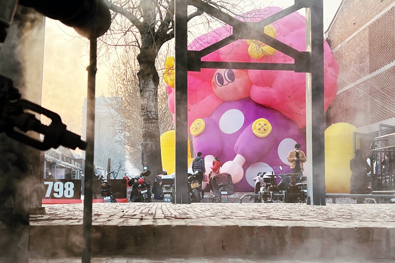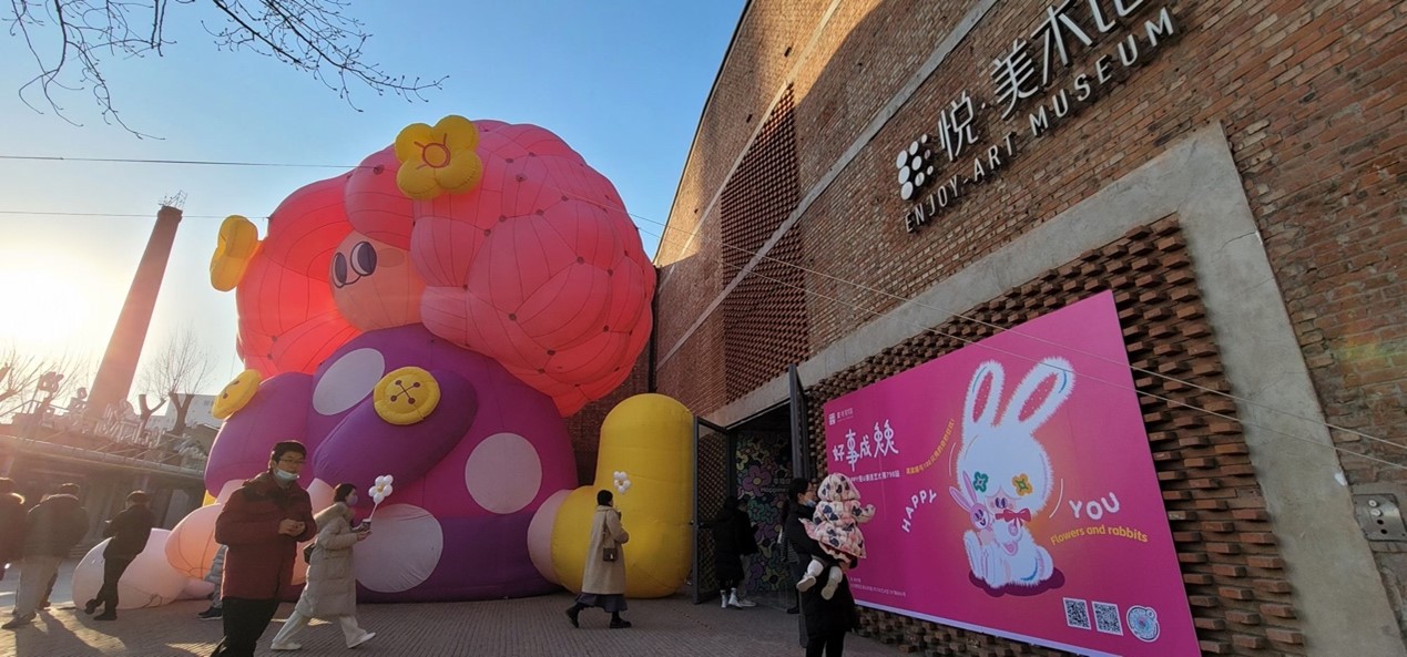 2023年新年伊始,北京798艺术区迎来了一位“超大号女孩”——巨型艺术装置其其格。她有着一头蓬松的粉色头发,头戴黄色小花,坐在悦·美术馆门前。近日,“好事成兔兔”潮流艺术展在这里开展,巨型艺术装置其其格与100只“兔兔”共同掀起了观展热潮。