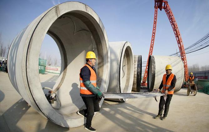 图为工人在北京南水北调配套工程大兴支线新机场水厂连接线工地搬运建筑材料。新华社记者李欣 摄