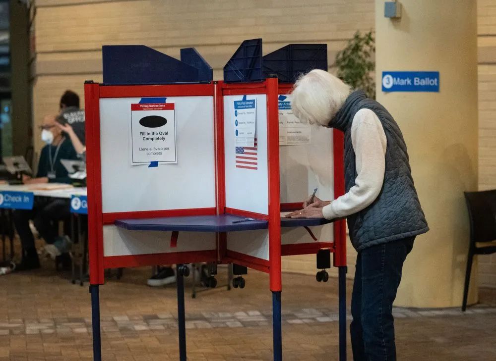 2022年11月8日,美国国会中期选举在政治极化、社会撕裂、通货膨胀“高烧不退”以及大多数人对国家走向不满的背景下举行。图为选民在美国弗吉尼亚州阿灵顿的一处投票点参加中期选举投票。新华社记者 刘杰 摄