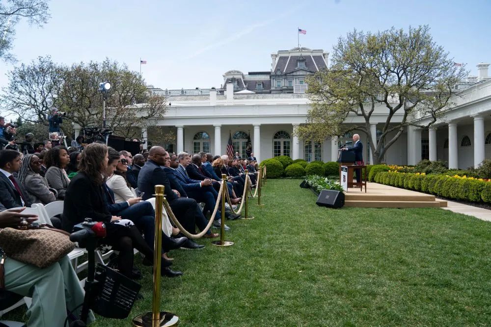 2022年4月11日,美国总统拜登(右一)在华盛顿白宫就监管“幽灵枪”的新规发表讲话。新华社记者 刘杰 摄