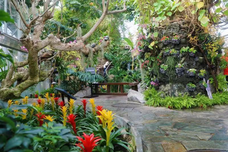 记者看到,热带展览温室主要划分为四个展区:四季花园展室、兰花凤梨及食虫植物展室、沙漠植物展室以及热带雨林展室。丰富多彩的植物景观让您大开眼界的同时更能增长知识。