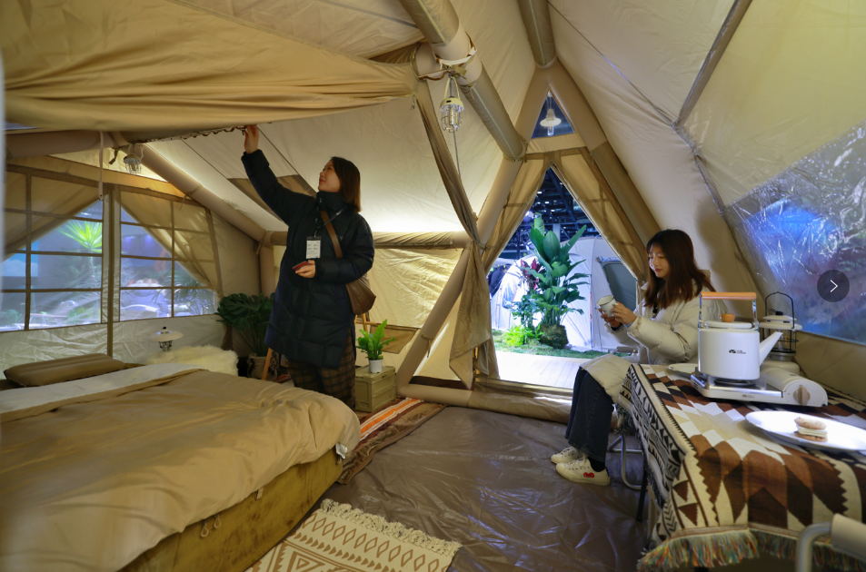 “这是我们新研发的自驾充气帐篷,只需两三分钟就能充好气,非常方便。”在揽盛展台,工作人员正带领人们体验一款造型别致的帐篷,帐篷的一侧与车辆后备厢连接,打通了车内空间和帐篷空间,既可以躺在车辆后备厢的垫子上休息,也可以坐在小桌前品尝美食。“车内空调的凉风可以吹到帐篷里,这样夏天出来露营也不用担心热啦!”一些露营爱好者对这款帐篷情有独钟,纷纷咨询购买方式,现场工作人员透露,这款产品预计今年3月将推向市场。