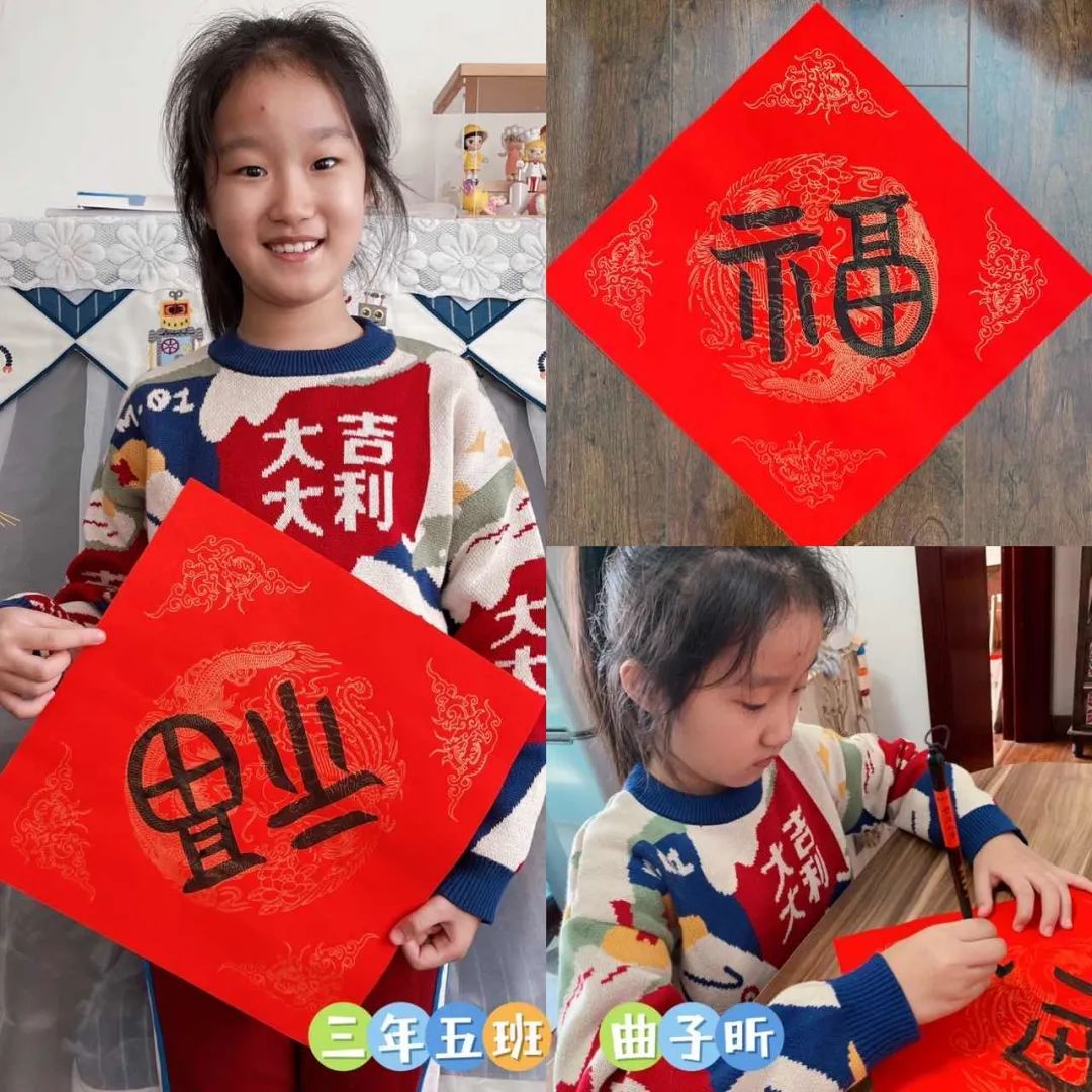 长桌排开,笔墨铺就,小小书法家们在家齐上场:即席挥毫,大展身手,一撇一捺里,年味悄然晕染。石油附小每一位学生都收到了学校发的 “兔个如意” 寒假作业,老师们根据不同年级孩子的特点,布置了不同形式的感受年味作业。其中,有一项必做的作业就是写福字、作春联,孩子们都积极踊跃,年三十前便纷纷准备好笔墨纸砚一展身手。