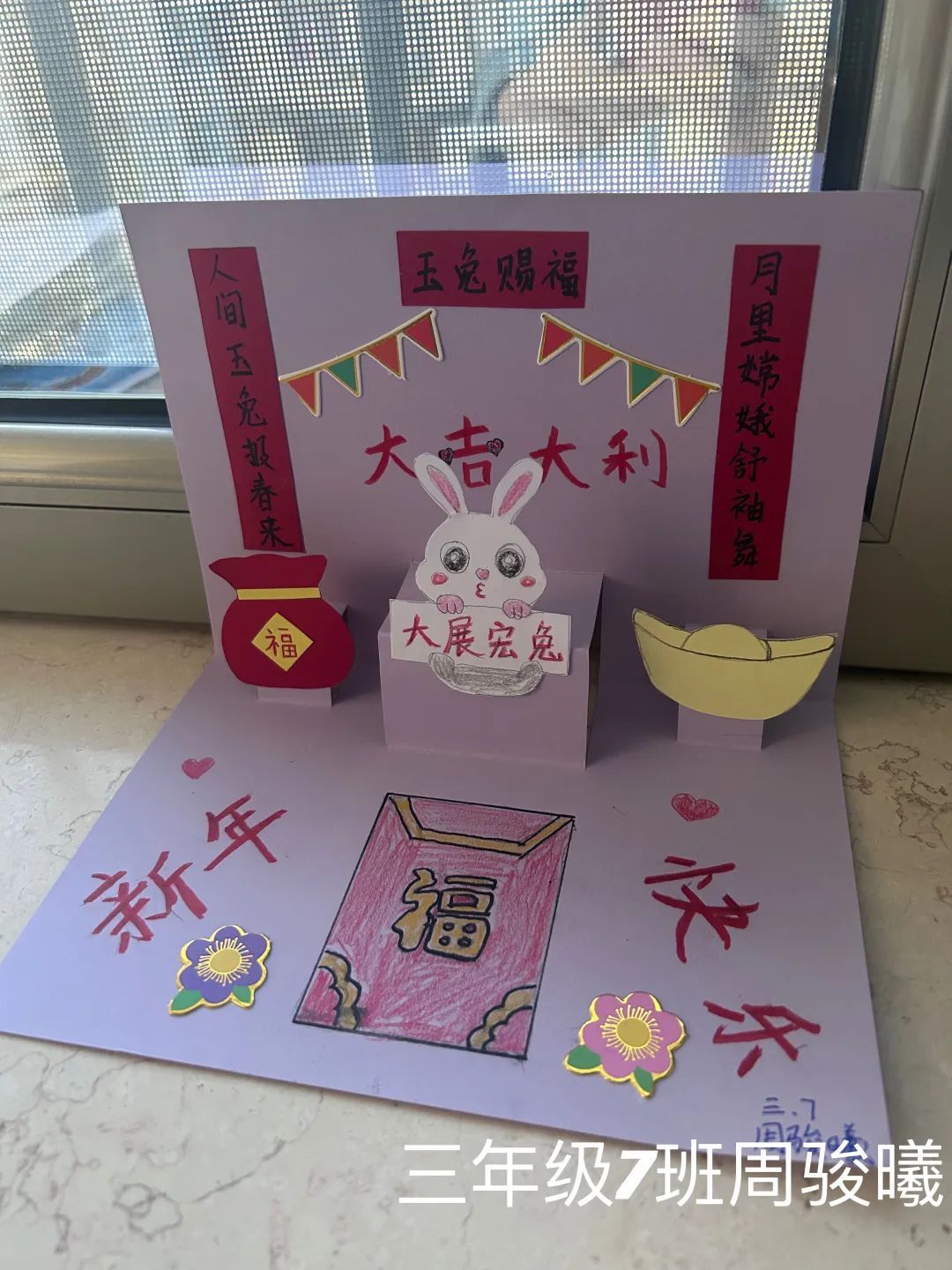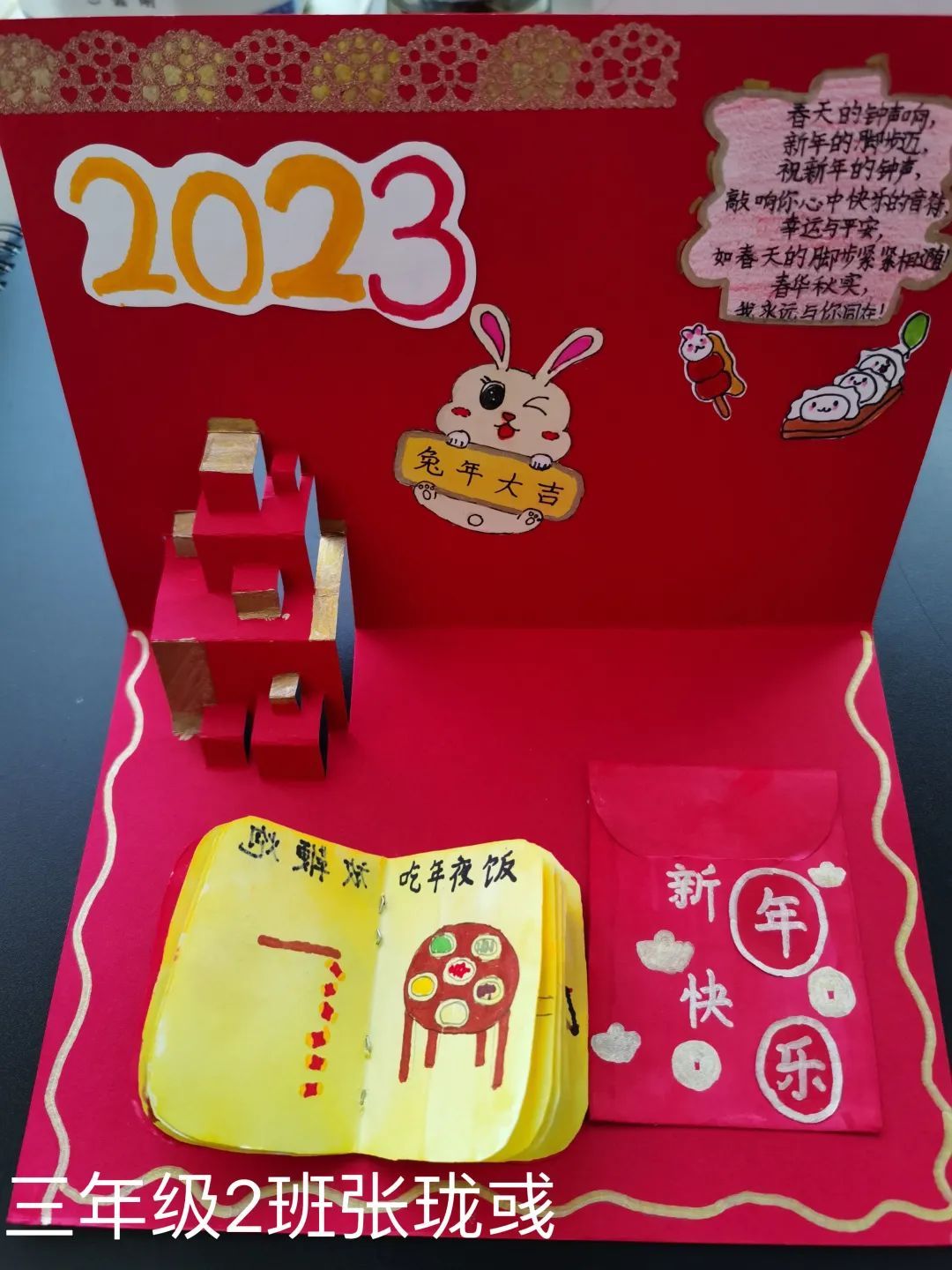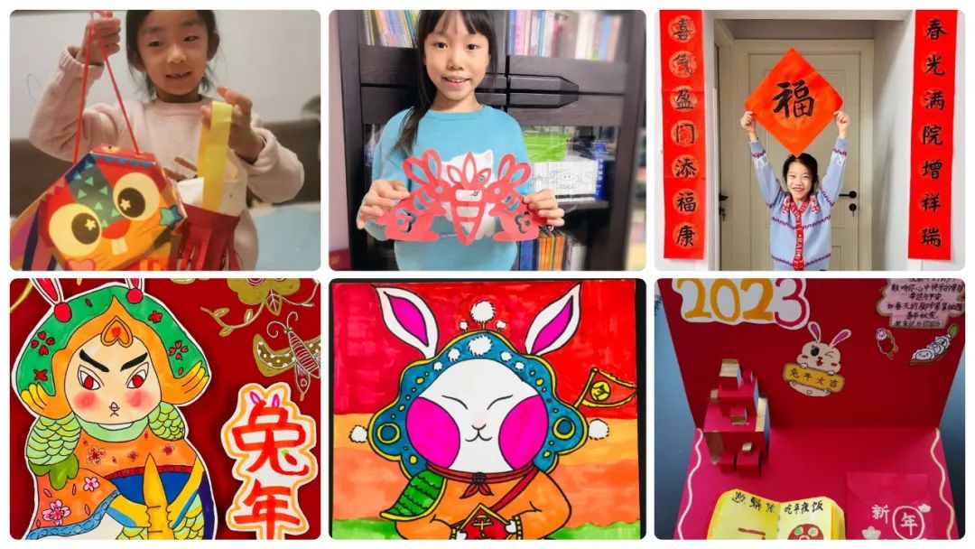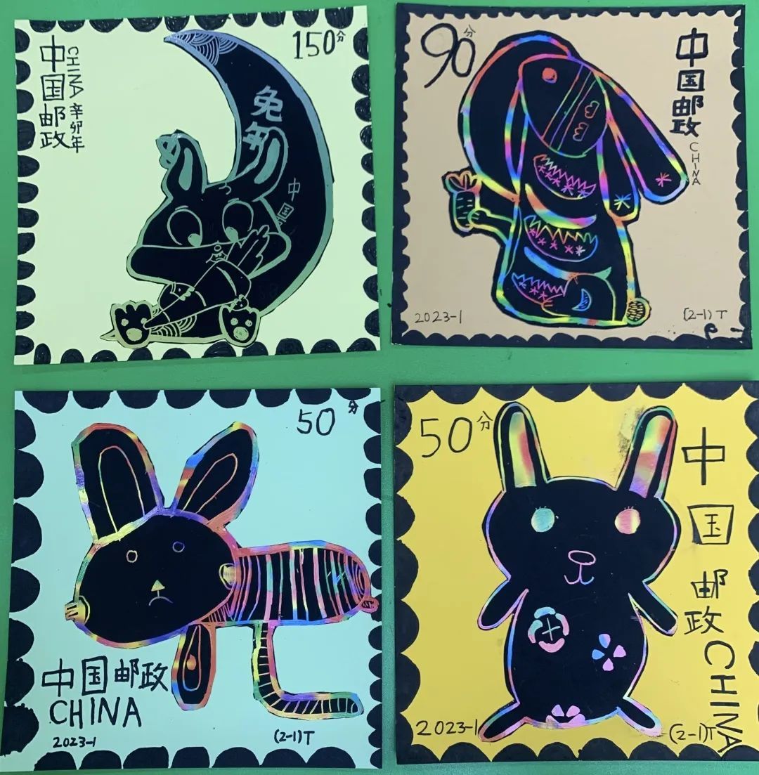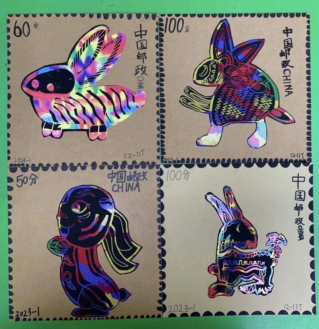 这个寒假,美术组教师巧妙结合国家课程,精心设计了兔年主题的艺术实践活。同学们参与热情高涨,投稿踊跃:有的用刮画纸探究不同工具所留下线条粗细和疏密的变化,制作的兔子造型邮票;有的运用彩纸及不同材料,通过剪、折、贴、画等形式,设计制作新颖、独特,极具美感的兔年主题贺卡;还有用2023四个数字设计的吉祥萌兔等等。作品喜庆祥和、红红火火充满了传统的年味,同学们用自己的作品迎接新春的到来,表达对新年的祝福,彰显了生活的种种志趣,展现了学校艺术教育的累累硕果。