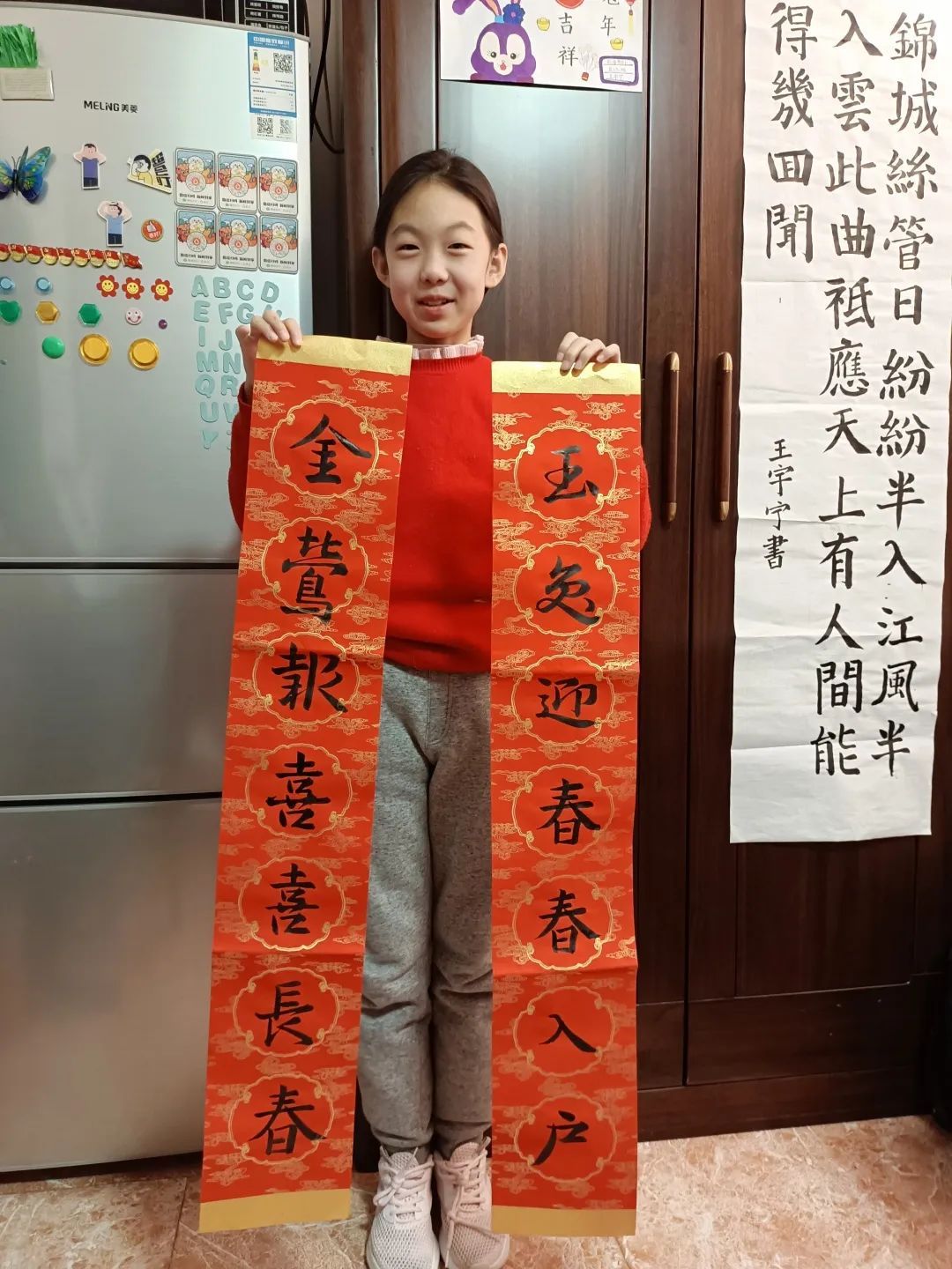 三年级学生邢曜瑾从小就热爱书法,这是她第一次为家里写春联," 我和妈妈一起去超市买来了红色的纸,自己写了一副对联,上联‘喜气盈门添福康’,下联‘春光满院增祥瑞’,横批‘春满人间’。" 正式起笔前,邢曜瑾先在草稿纸上练习了几遍,然后誊写在红纸上。看着自己挥就的对联贴好了,她的自豪感油然而生,爸爸妈妈也特别激动。