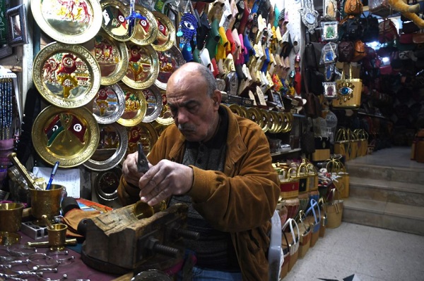 1月9日,一名工匠在突尼斯首都突尼斯市老城制作传统手工艺品。图源:新华社