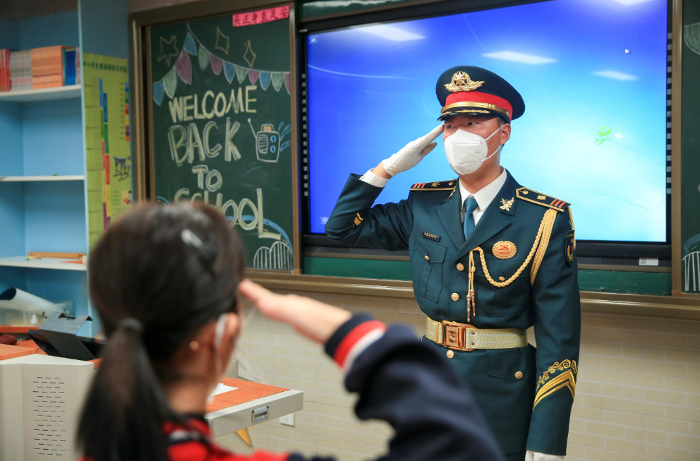 为将爱国主义教育和国防安全教育根植到学生心中,昌平区第五学校邀请到3名退役军人,针对小学和初中不同的需求,设置了《祖国河山,寸土不让》《国家利益高于一切,三军形象重于泰山》《我是护旗手》《抗疫英雄》等课程内容,旨在提升学生们的国防意识,培育爱国情怀。