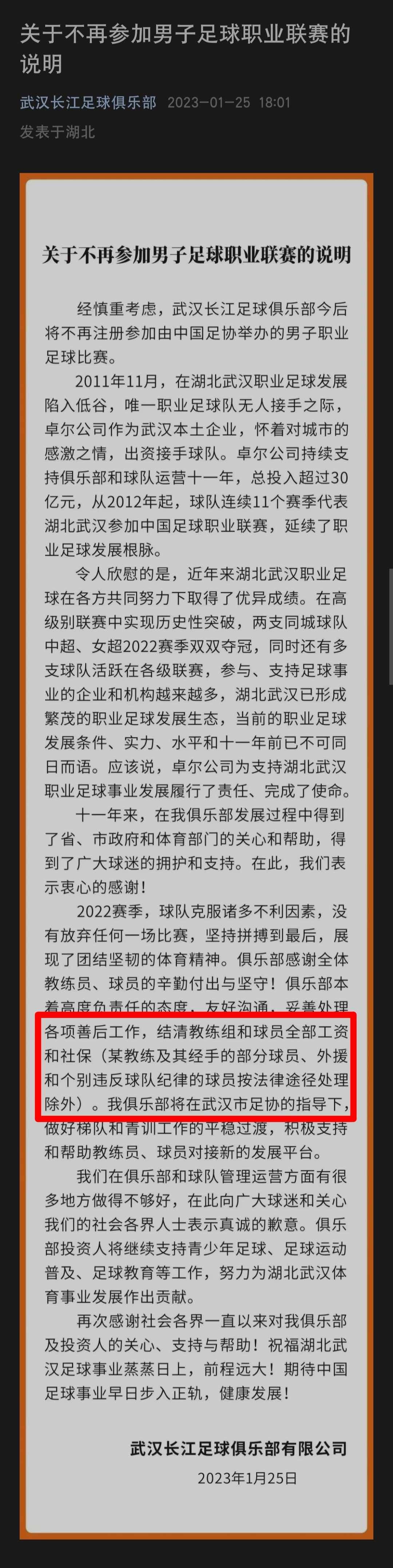 在这份《关于不再参加男子足球职业联赛的说明》中,武汉长江足球俱乐部有限公司明确,将妥善处理各项善后工作,结清教练组和球员全部工资和社保,并专门提到“某教练及其经手的部分球员、外援和个别违反球队纪律的球员按法律途径处理除外”。