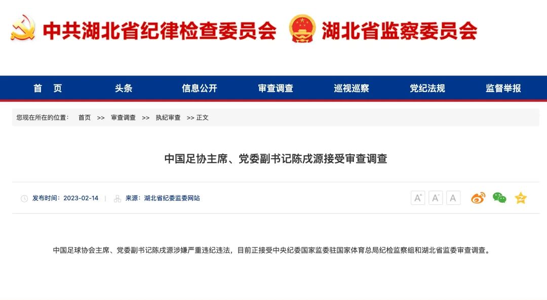 2月14日,湖北省纪委监委通报中国足球协会主席、党委副书记陈戌源涉嫌严重违纪违法接受审查调查。