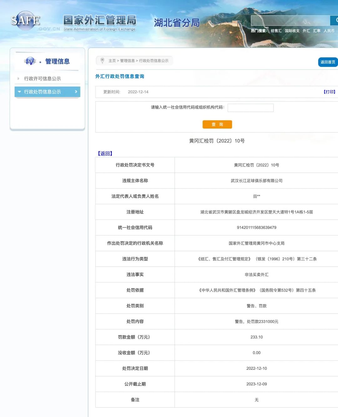 图为国家外汇管理局湖北省分局官网行政处罚信息截图。