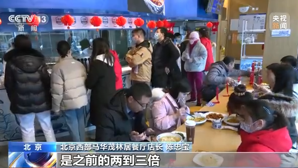 北京西部马华茂林居餐厅店长 陈忠宝:现在我们进货都是之前的两倍到三倍左右,所有的原材料一样,包括我们现在的翻台率,是之前的两到三倍,现在的客流量比之前好很多。