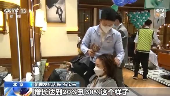 北京某理发店店长 石宝玉:因为客户有的烫染比较多,同比的话我们这个客户量增长达到20%—30%这样子,业绩同时也增长了一些。